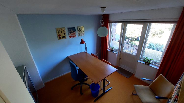 De balkonkamer (zie foto) is te boeken als je in alle rust (aan je manuscript) wilt werken. Deze is 3 x 3,5 meter groot en heeft een fraai uitzicht over een tuin van 20 meter diep. Ook kun je grasduinen in cursusmateriaal, boeken over het schrijfvak, kinderboeken – ook de boeken die zijn gepubliceerd door mensen die ik heb begeleid – en schrijfopdrachten. Daarnaast mag je altijd vragen stellen als ik in de bovenkamer – mijn kantoor – aan het werk ben. Ik ben dan jouw schrijfcoach op afroep.
